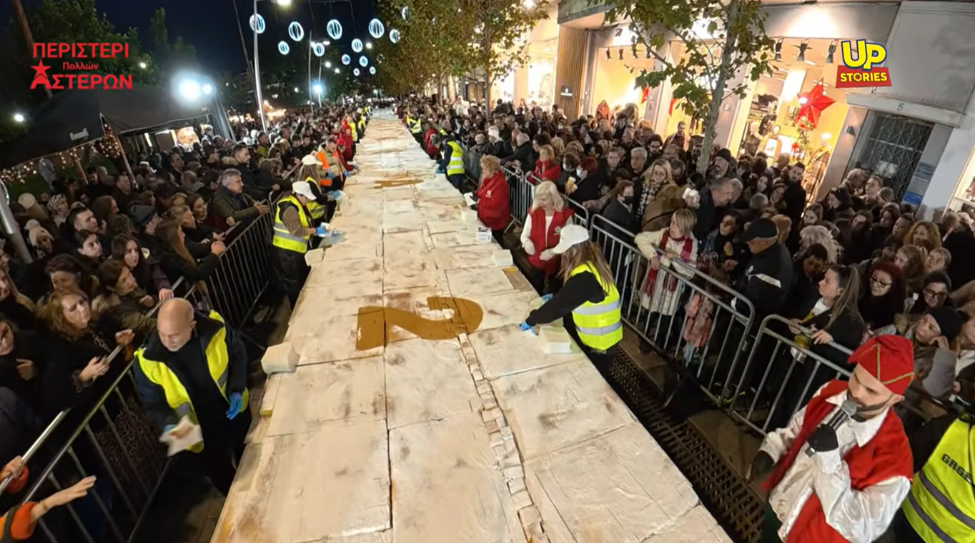 Η Συντεχνία Αρτοποιών Αθηνών, Προαστίων & Περιχώρων (ΣΑΑΠΠ), σε συνεργασία με τον Δήμο Περιστερίου, δημιούργησαν μια εντυπωσιακή βασιλόπιτα που ξεπέρασε κάθε προηγούμενο ρεκόρ: περισσότερα από 80.000 κομμάτια, συνολικού βάρους 10 τόνων και μήκους άνω των 100 μέτρων, διανεμήθηκαν δωρεάν στους πολίτες, μετατρέποντας τον πεζόδρομο σε μια μεγάλη γιορτή χαράς, συμμετοχής και αισιοδοξίας για τη νέα χρονιά.