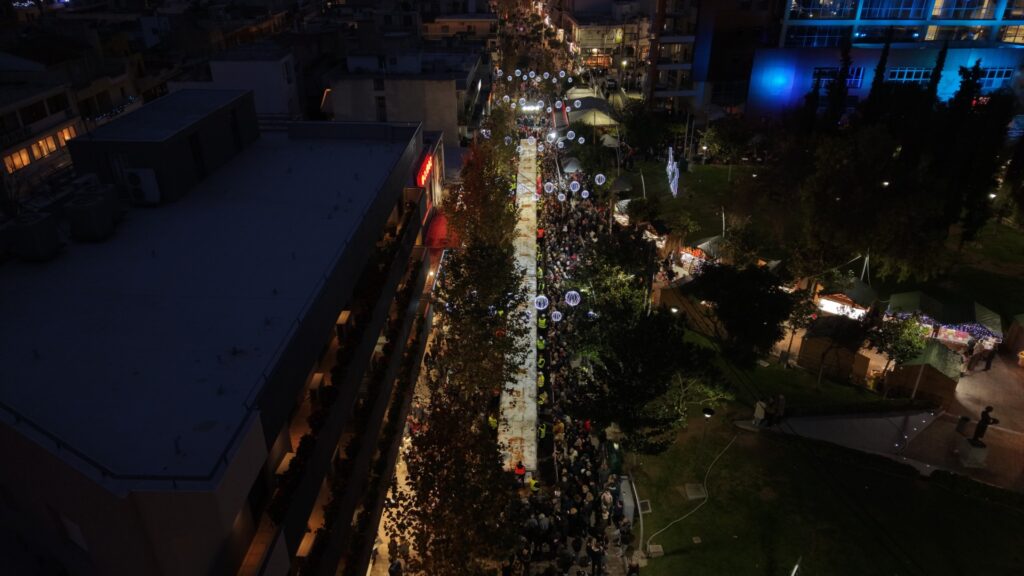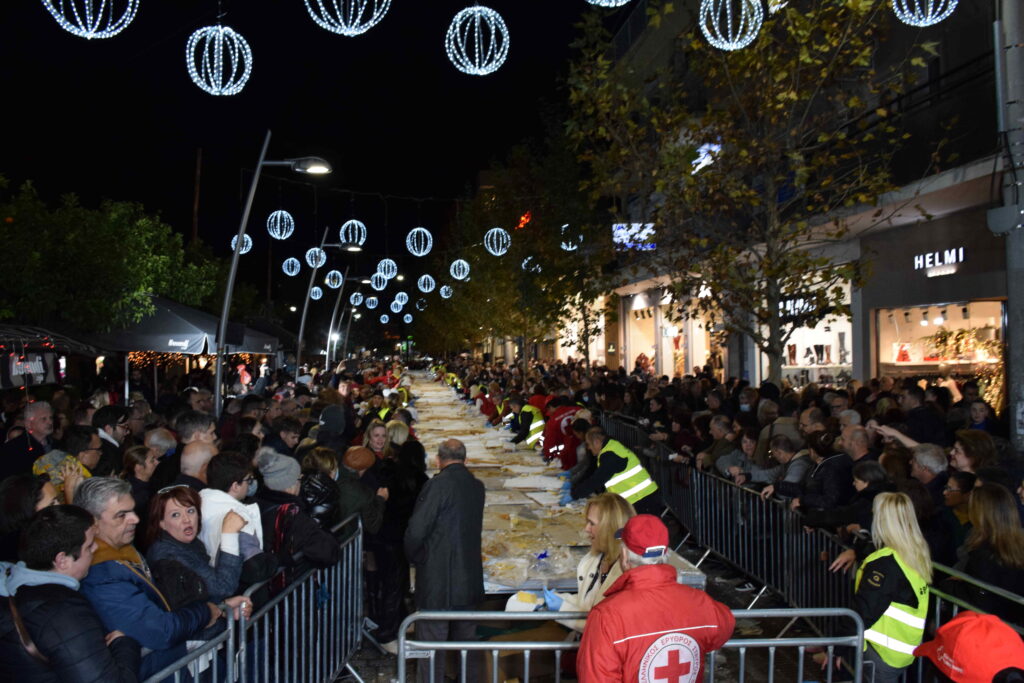 Η Συντεχνία Αρτοποιών Αθηνών, Προαστίων & Περιχώρων (ΣΑΑΠΠ), σε συνεργασία με τον Δήμο Περιστερίου, δημιούργησε μια εντυπωσιακή βασιλόπιτα που ξεπέρασε κάθε προηγούμενο ρεκόρ: περισσότερα από 80.000 κομμάτια, συνολικού βάρους 10 τόνων και μήκους άνω των 100 μέτρων, διανεμήθηκαν δωρεάν στους πολίτες, μετατρέποντας τον πεζόδρομο της πόλης σε μια μεγάλη γιορτή χαράς, συμμετοχής και αισιοδοξίας.