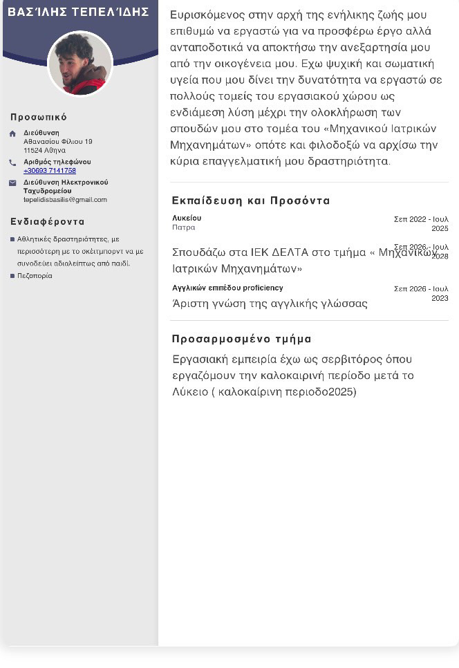 Eνδιαφέρομαι να εργαστώ ως βοηθός αρτοποιού. Συνημμένα σας διαβιβάζω το βιογραφικό μου.Τεπελίδης ΒασίληςΤηλ. επικοινωνίας: 6937141758